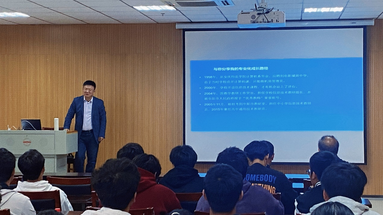 学院特邀阜阳市教育局正高级教师冯士海、中国海洋大学教授汪克亮和安徽大学博士后赵大卫三位优秀校友来校共话前沿科技与职业规划。交流会吸引了一年级研究生和本科生70余人参加,王一宾教授和程玉胜教授分别主持活动。