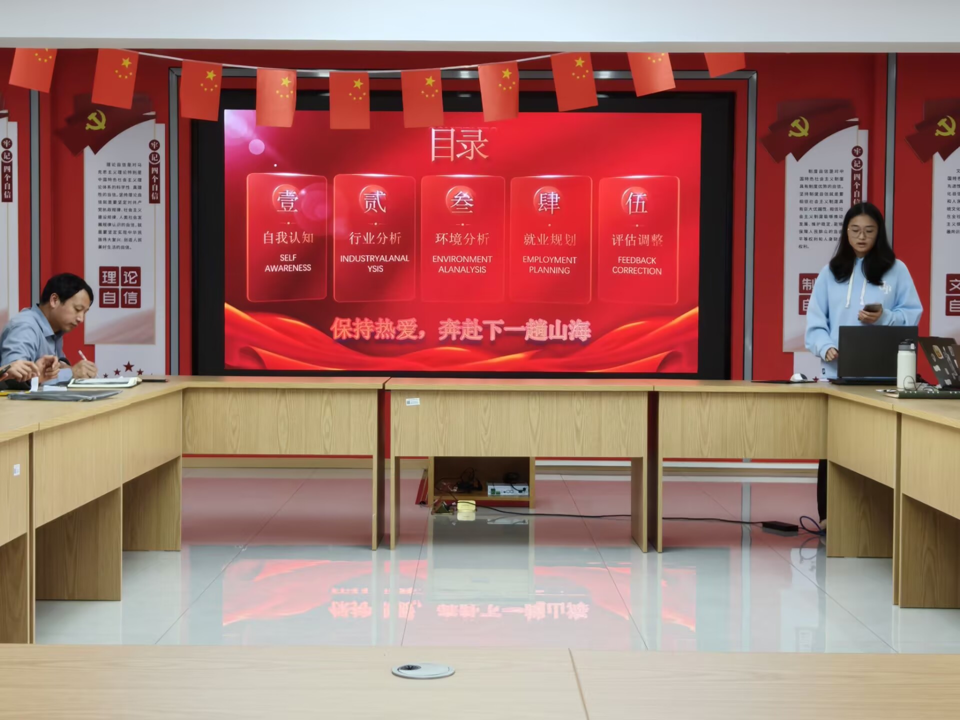 比赛现场,气氛紧张而热烈。16位参赛选手依次登台,结合精心制作的PPT,从自我认知、职业环境分析、职业目标定位、评估与调整等方面,进行了全面而精彩地展示。