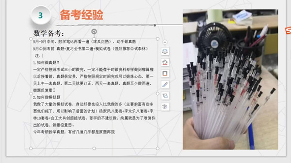 报考研究生已经成为毕业生就业的重要渠道之一,也是大学生学历和能力提升的重要途径,学院历来高度重视考研动员、指导、服务等工作,今年考研率维持在近30%的历史水平。尽管受疫情影响,但学生们的考研热情不减,学院为学生考研提供多渠道的关心与帮助,此次考研交流会就是充分考虑学生具体需求,发挥了朋辈榜样作用,帮助2021届考研学子了解考研流程,科学制定考研目标,掌握必要的备考技巧,为大家信息沟通、规划备考成功搭建了平台,促进了学院学风建设。(撰稿:潘安宇 摄影:吴迪 审核:江伟)