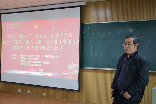 3月30日,学院在L楼314教室举办2021年“新生杯”程序设计竞赛颁奖暨2022年安徽省机器人大赛-程序设计赛道校内选拔赛启动仪式,学院党委副书记江晋剑、副院长吴健出席仪式。教师第一党支部、计算机科学与技术教研室老师及学生等80余人参加活动。