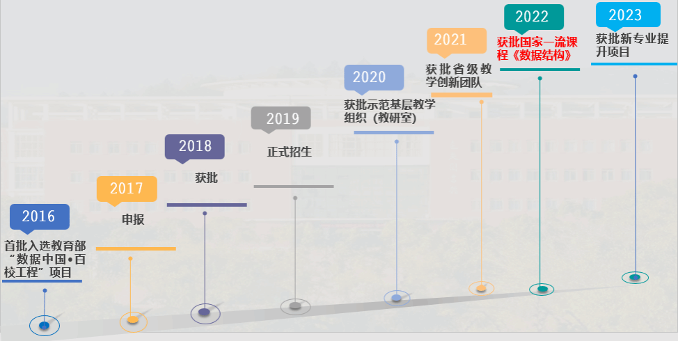 数据科学与大数据技术专业,2016年首批入选教育部“数据中国•百校工程”项目,2017年开始申报,2018年获批,2019年正式招生。2022年《数据结构》获批第二批国家线上线下混合式一流课程。