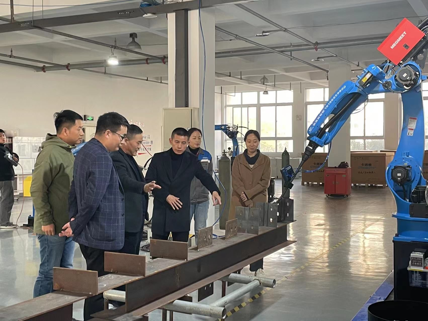 王远志一行实地参观了企业的研发中心和应用中心,观看了企业在机器人、机器视觉等领域的先进技术和工业应用。王远志介绍了学院基本情况和人工智能产业学院建设现状。他表示,现代产业学院作为“产教融合”的创新模式,通过引导高校面向区域、面向行业、面向产业办学,培养出发展所需要的特色型技术人才。产业学院将通过与企业的紧密合作,更好地满足社会对人才培养的需求,提高学生就业竞争力。通过校企联合招生,将课程内容、教学方式与生产实践对接,企业需要什么岗位的人才,学校订单式设置相关专业和课程。吴海峰介绍了学院毕业生实习就业等情况,希望双方加强校企合作,逐步将订单式培养落到实处,并表示期待在相关专业的实习和就业上与企业达成深度合作。奥维斯智能设备公司负责人介绍了公司的规模、业务领导、科研团队,并提出了在人工智能、机器人领域的人才需求情况,表达了期待与我院相关专业合作进行人才培养的愿景。物联网工程专业负责人汪文明和智能科学与技术专业负责人施赵媛分别介绍了相关专业人才培养方案,表达了相关专业在学生实践技能培养方面的迫切需求。双方就订单式人才培养的课程设置和培养方案进行了深入讨论。