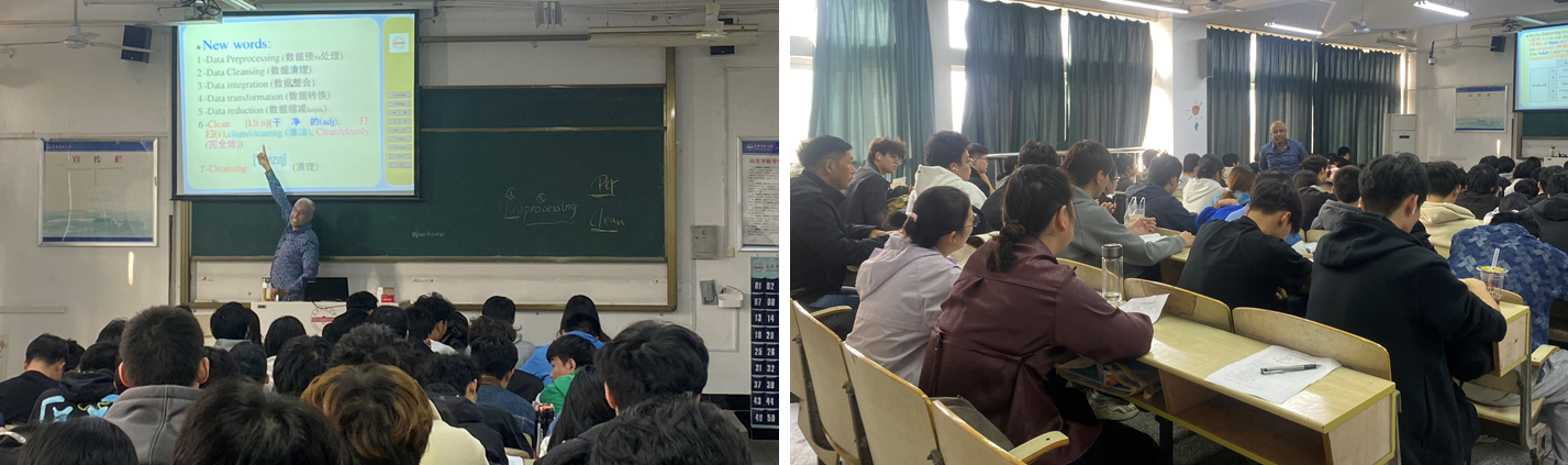 阿里老师以其丰富的教学经验和深厚的专业知识,进行中英双语教学,为学生们详细解读了数据预处理的概念和专业术语。阿里老师授课认真,充满激情,通过词义辨析、纠正发音、互动问答等多种教学方式,鼓励学生积极参与课堂教学,激发学生的学习兴趣,加深学生对大数据专业英语的理解。