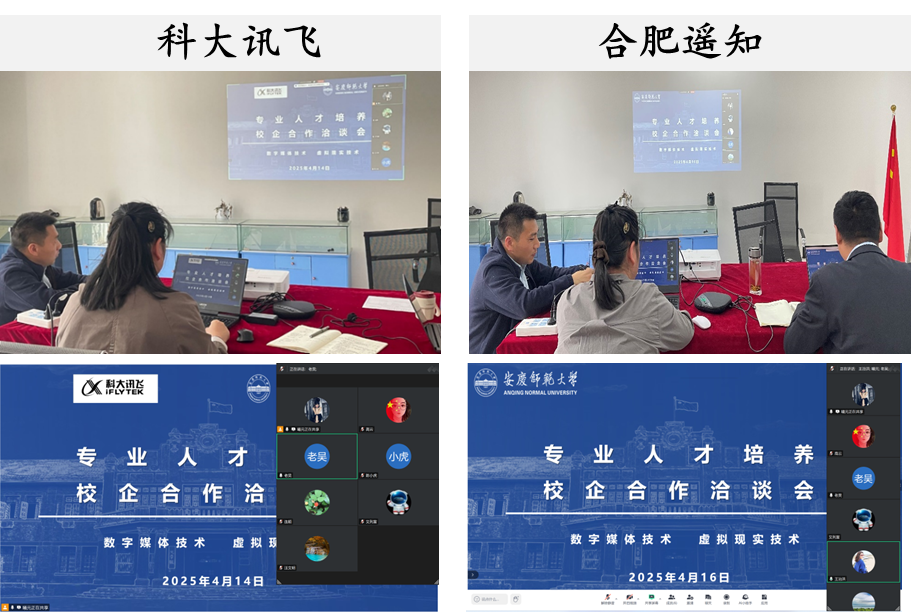 为加强校企交流、提升人才培养的针对性与实效性,4月14日和16日,数字媒体技术教研室和虚拟现实技术教研室分别与科大讯飞股份有限公司和安徽遥知信息技术有限公司进行了座谈交流。