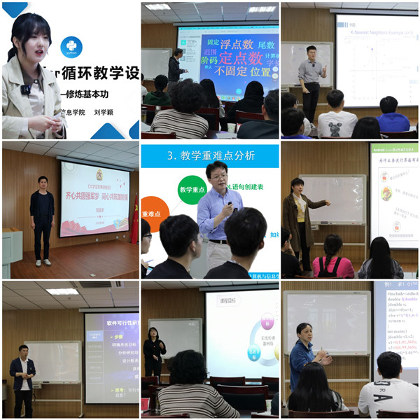 比赛中,老师们遵守规则“各显神通”,分别从教学目的、教学方法等方面展开教学,在专业知识讲解中融入家国情怀、社会责任、人文精神、文化传承等思政元素,展示了各具特色的教学设计和教学风采。曹立群老师以“乡村振兴的种子遴选问题”作为案例导入最近邻分类算法(KNN),巧妙的融入思政元素,并且在课堂最后对该案例进行升华性的探讨,增强学生在专业学习时的责任感和主人翁意识;宋静老师用一段C语言程序段的运行结果,引出定点数和浮点数底层表示不同,通过IEEE754国际标准规定,让同学们认识到规范的重要性,进而树立和增强社会主义法制观念;刘学颖老师用身份证的发展引入“迭代与遍历”这一主题,从for循环的应用和身份证数位的变化让学生分组讨论,引导学生思考;蒋京老师以教学的三维目标——知识与技能、过程与方法、情感态度与价值观为宗旨,在教学中实现润物有声,培养学生创新能力……在20分钟的教学展示过程中,各位参赛老师依据课程特点,逻辑清晰、语言简练、方法得当,深入挖掘了所授课程蕴含的思政元素和育人功能。