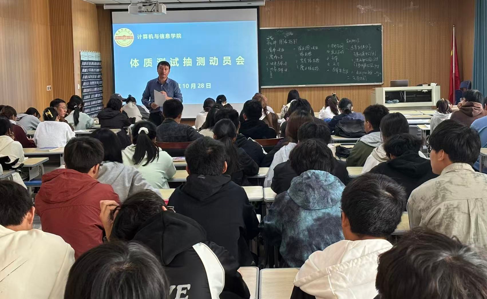 10月28日,学院在314教室召开体质测试抽测动员会。学院党委副书记肖之进、团委负责人、抽测涉及班级辅导员及80名抽测学生代表参加会议。