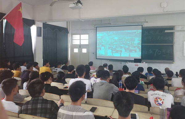师生们与直播同步,全体起立高唱国歌,把五星红旗戴在胸前,聆听习近平总书记的重要讲话,在激昂的乐声中感受中国共产党领导下的盛世欢腾。尤其是阵容空前的阅兵、国之利器的展示让现场师生为之动容,纷纷感叹中华之伟大,用掌声祝福伟大祖国繁荣昌盛、国富民强,表达了爱我中华的激动与自豪。