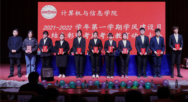 会上,辅导员李培森对2021年下半年学风建设月活动进行了总结,通报了2021-2022学年第一学期课堂教学巡查、文明寝室创建、大一晚自习出勤等情况,宣读了获得“优良学风班集体”的名单,刘远泽宣读了“五星级寝室”和“五星级示范寝室”名单。然后,院长王一宾为优良学风班集体颁发了奖状,副院长吴健为文明寝室颁发了奖状。