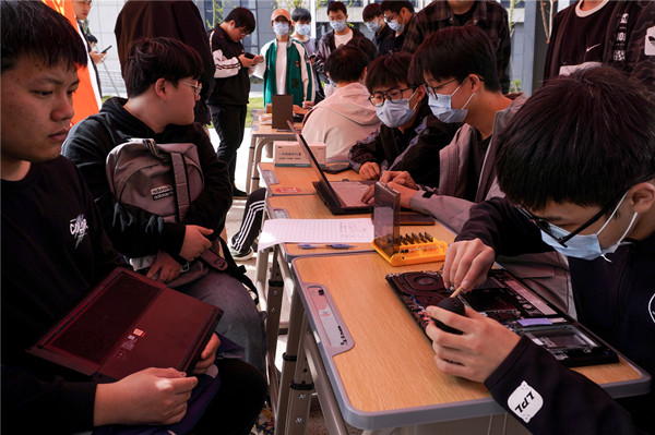 安装驱动、主板清灰、电脑杀毒……对数字媒体技术专业2020(1)班的张凯旋而言,帮助学生们解决简单的电脑问题,是一件很有成就感的事情。他手拿小螺丝刀,慢慢拧开电脑后盖,仔细地用小刷子拂去散热器上的灰尘。“在帮助一位同学的电脑清灰的时,我发现他的电脑后盖因为磕碰出现了两处凹陷,以至于很难拆开。”在与其他工作人员的共同合作下,张凯旋顺利揭下了背板。他表示,学习专业知识的目的就是希望能够结合实际为大家服务。