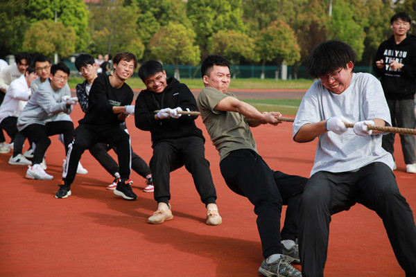 “大家把绳子握紧一点,前后站成一条线,把重心降低。”拔河比赛作为参与人数最多的压轴项目备受瞩目,各个班级队伍都在比赛前临时商讨取胜策略。随着裁判一声哨响,双方队员双手紧握长绳,咬紧牙关,整个身子都在用力向后倾斜,红色基准绳来回偏移。“加油!加油!还差一点!”场上的加油声呐喊声此起彼伏,更将现场的气氛推向高潮。
