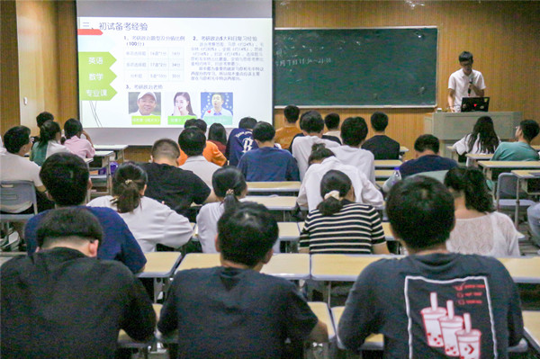 的李翔分别上台介绍成功经验。他们结合自身经历,从形势分析、院校选择、名师推荐、心态调整、具体科目学习方法等方面分享了宝贵的考研“干货”。