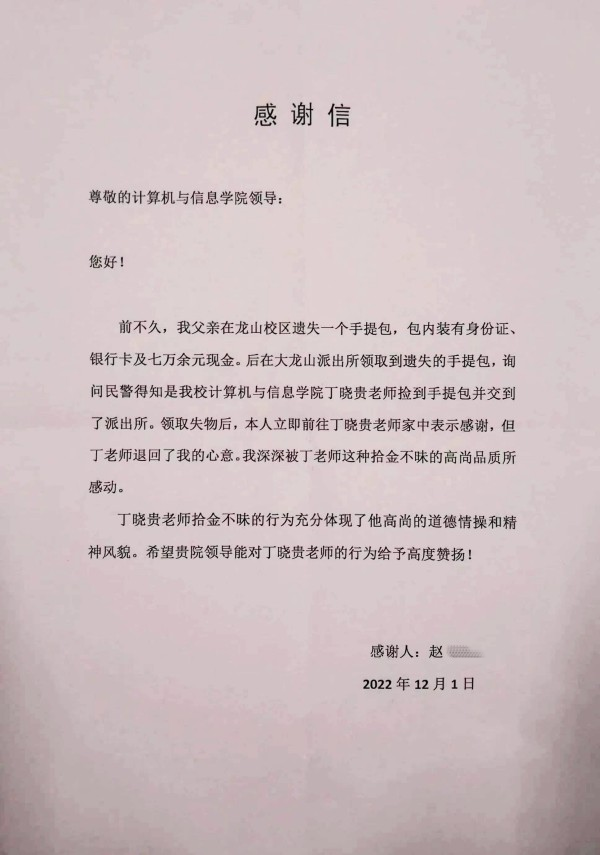 “我深深被丁老师这种拾金不昧的高尚品质所感动,希望贵院能对其行为给予高度赞扬。”近日,一封特别的信件被送到了我院。原来是我院丁晓贵老师拾金不昧,成功让失主一家找回丢失的七万余元现金及重要证件,失主家人为表达真挚的谢意,亲自送来了一封感谢信。