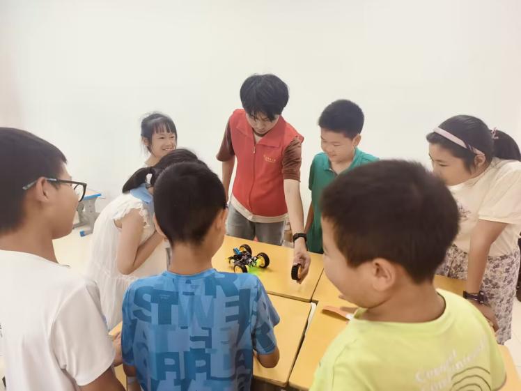 紧接着,在7月16日,团队队长、计算机类专业2023级(4)班的胡可仁携带自制单片机小车步入活动现场,为孩子们精彩讲解电子创意制作。房间内洋溢着成功的欢笑与创造的激情,每一处都闪耀着探索的光芒。暑期公益托管班班主任张一琪老师坦言:“孩子们在活动中展现了极大的热情与创造力,亲手制作的电子作品闪耀着智慧的光芒。科技教育如同种子,播撒在孩子们心中,相信未来会绽放出更加璀璨的花朵。”充分肯定了孩子们在本次活动中的收获。