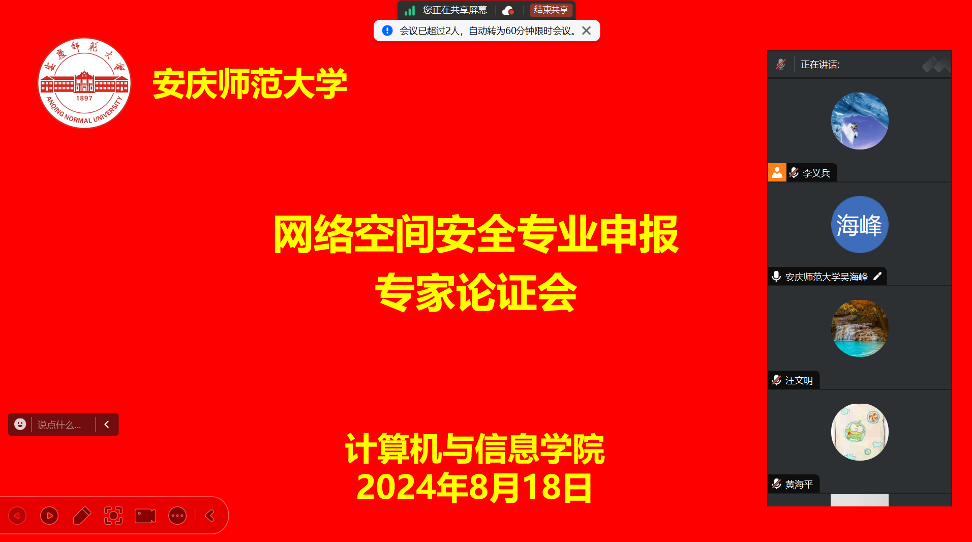 在线召开了网络空间安全专业申报专家论证会。会议邀请南京邮电大学网络空间安全学院副院长黄海平教授、暨南大学网络空间安全学院教授刘志全教授、安徽师范大学教授算机与信息学院副院长接标教授、安徽大学网络空间安全系主任朱二周博士、中共安庆市委网信办网络舆情管理和执法治理科科长章慎担任论证专家,教务处处长潘锦云、教研科科长朱亭曲、副院长王远志、物联网工程教研室主任汪文明、新专业教师代表及教学办公室成员参加论证会,会议由副院长吴海峰主持。