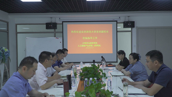 8月27日下午,校党委常委、副校长吴琼来我院调研指导工作,在安庆市筑梦新区人工智能产业学院(研究院)常驻办公地现场查看了学院的建设情况,参观了相关项目成果展,现场听取学院主要负责同志有关学院建设与发展情况的工作汇报,就学院发展存在的问题进行了研讨。学院党政主要领导、人工智能产业学院有关负责同志参加了调研活动。